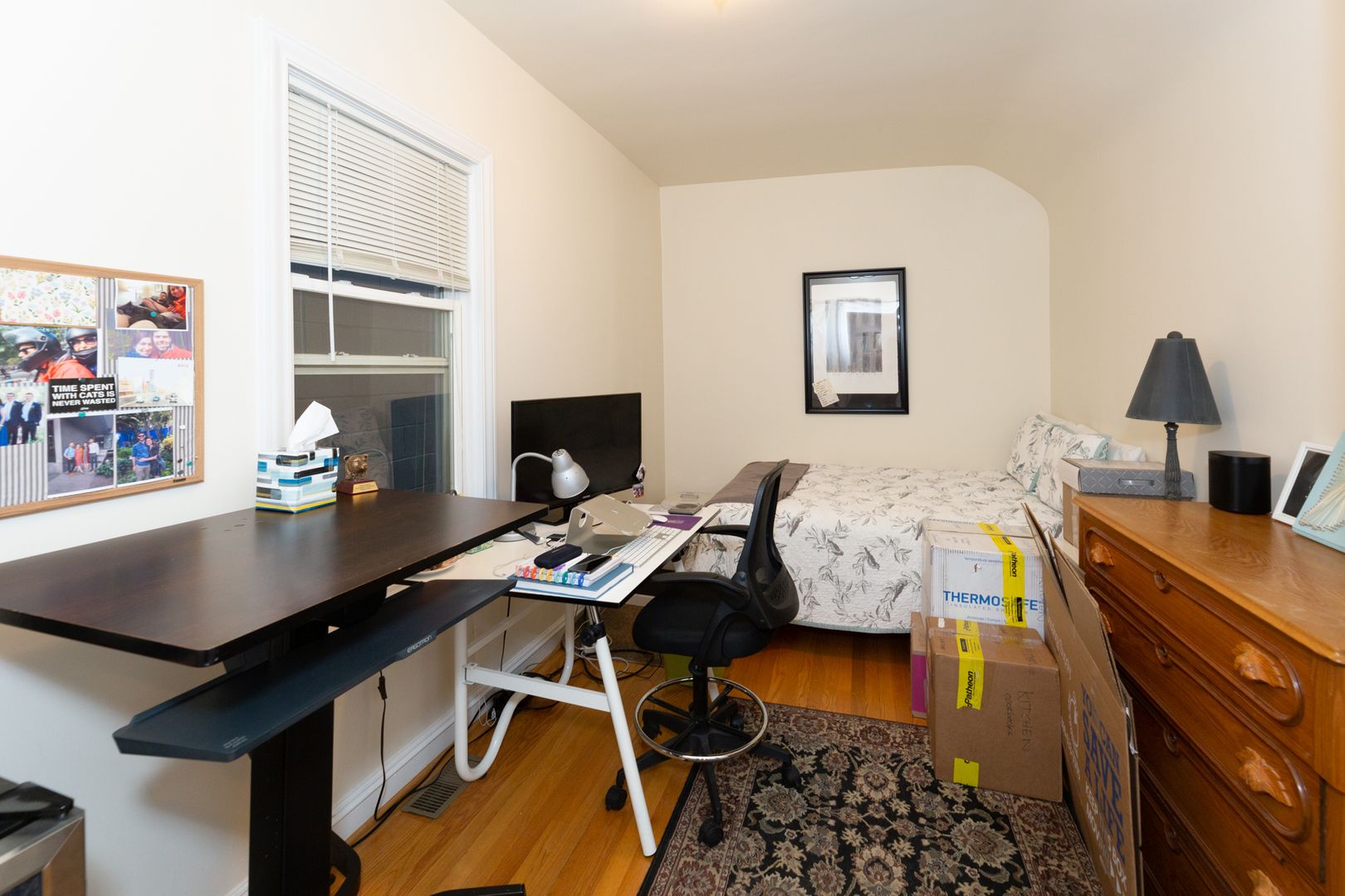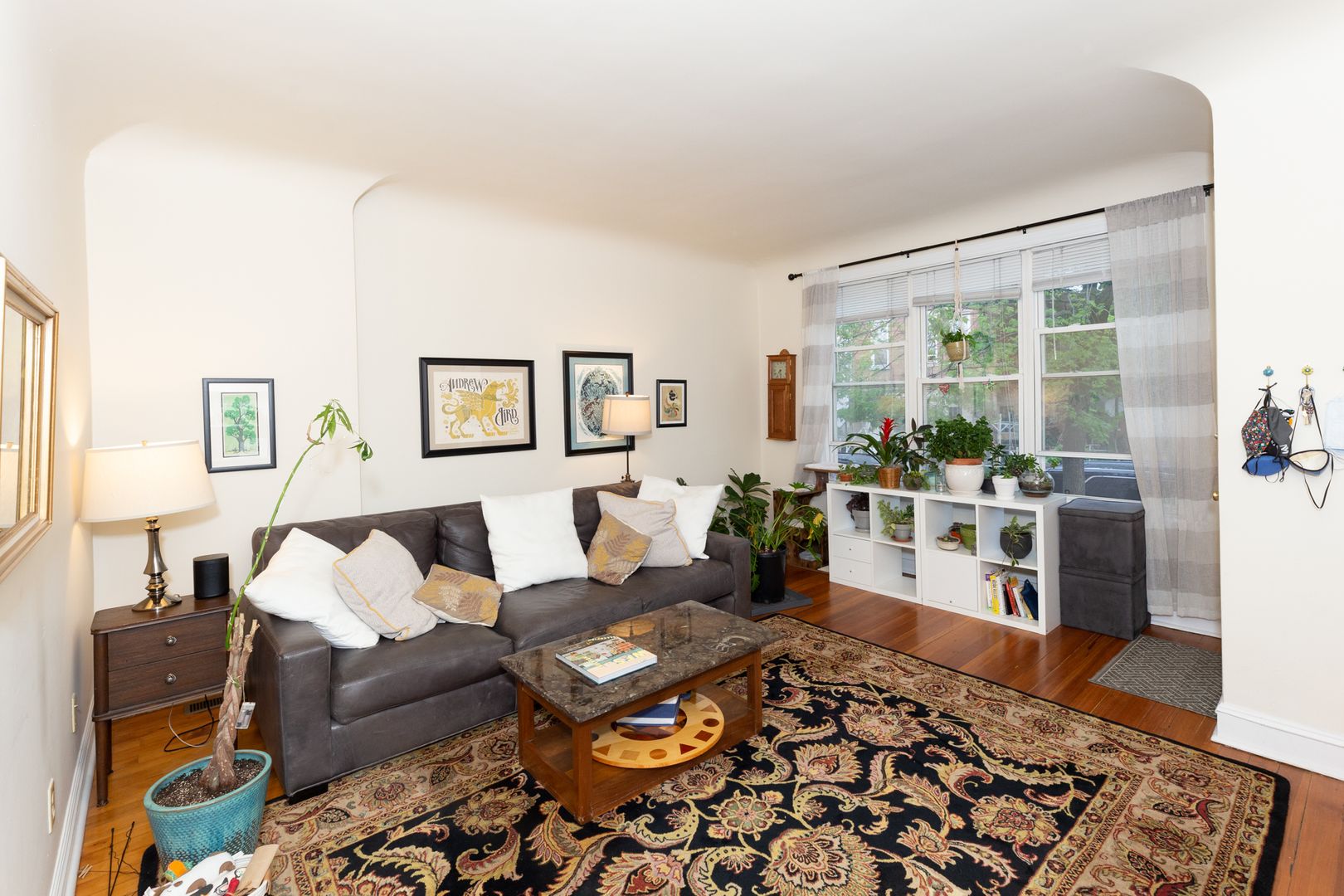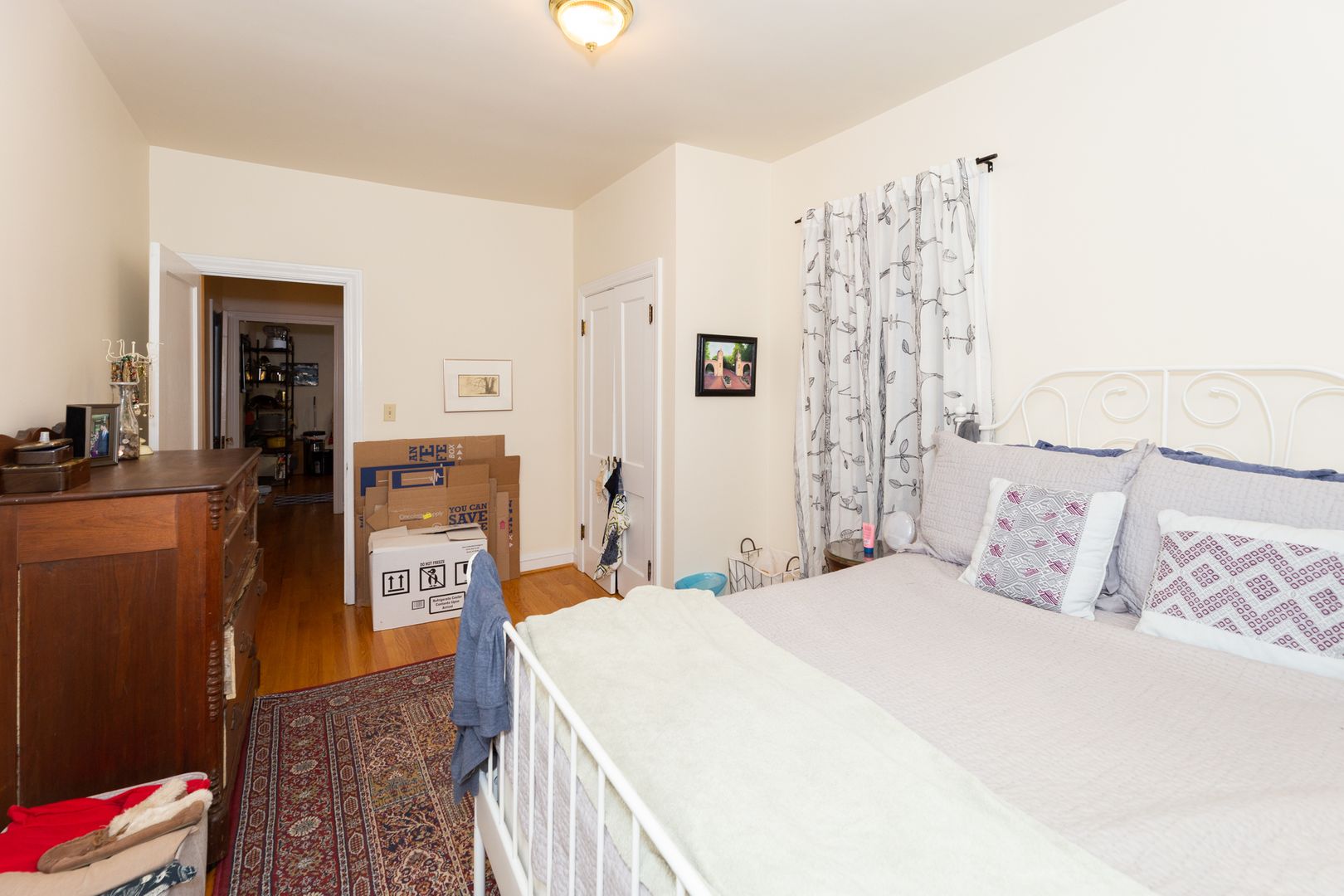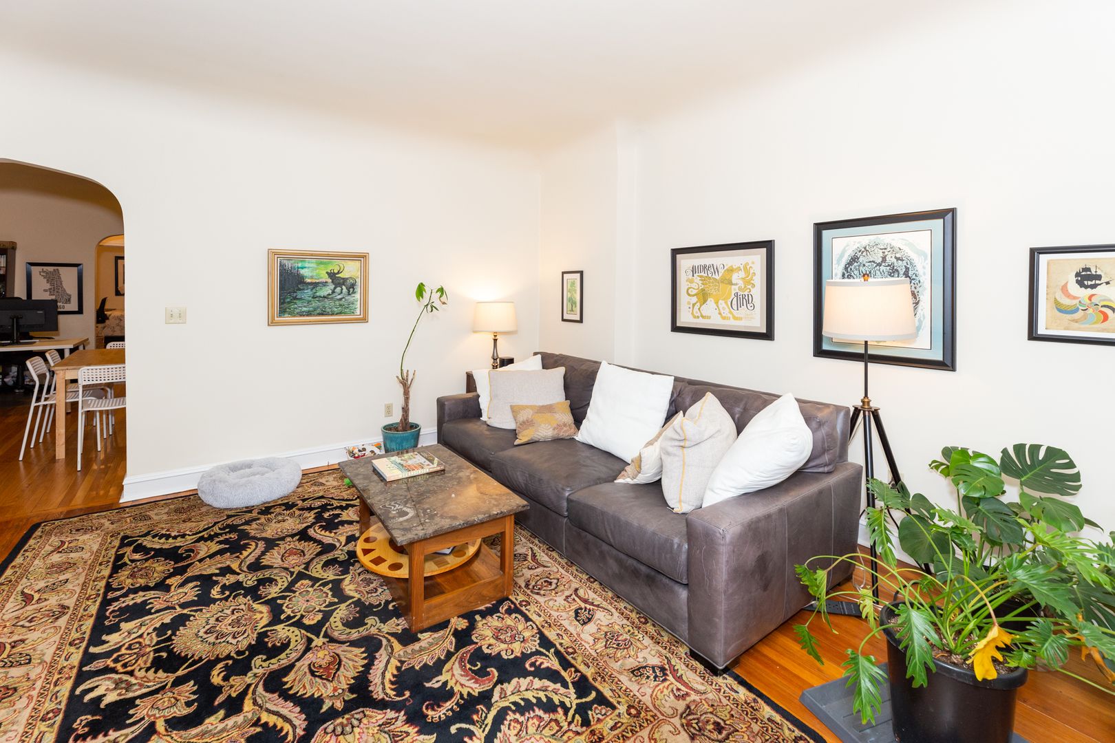 Great layout includes sunny living room, dining room, eat-in kitchen, and 2 large bedrooms with generous closet space. Hardwood floors throughout, as well as other vintage details.