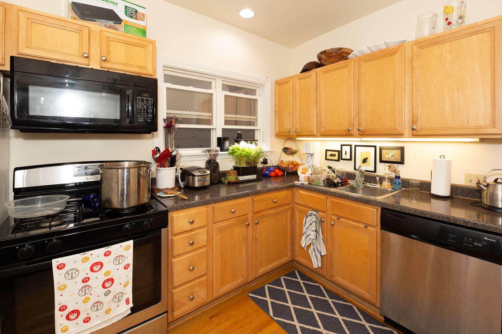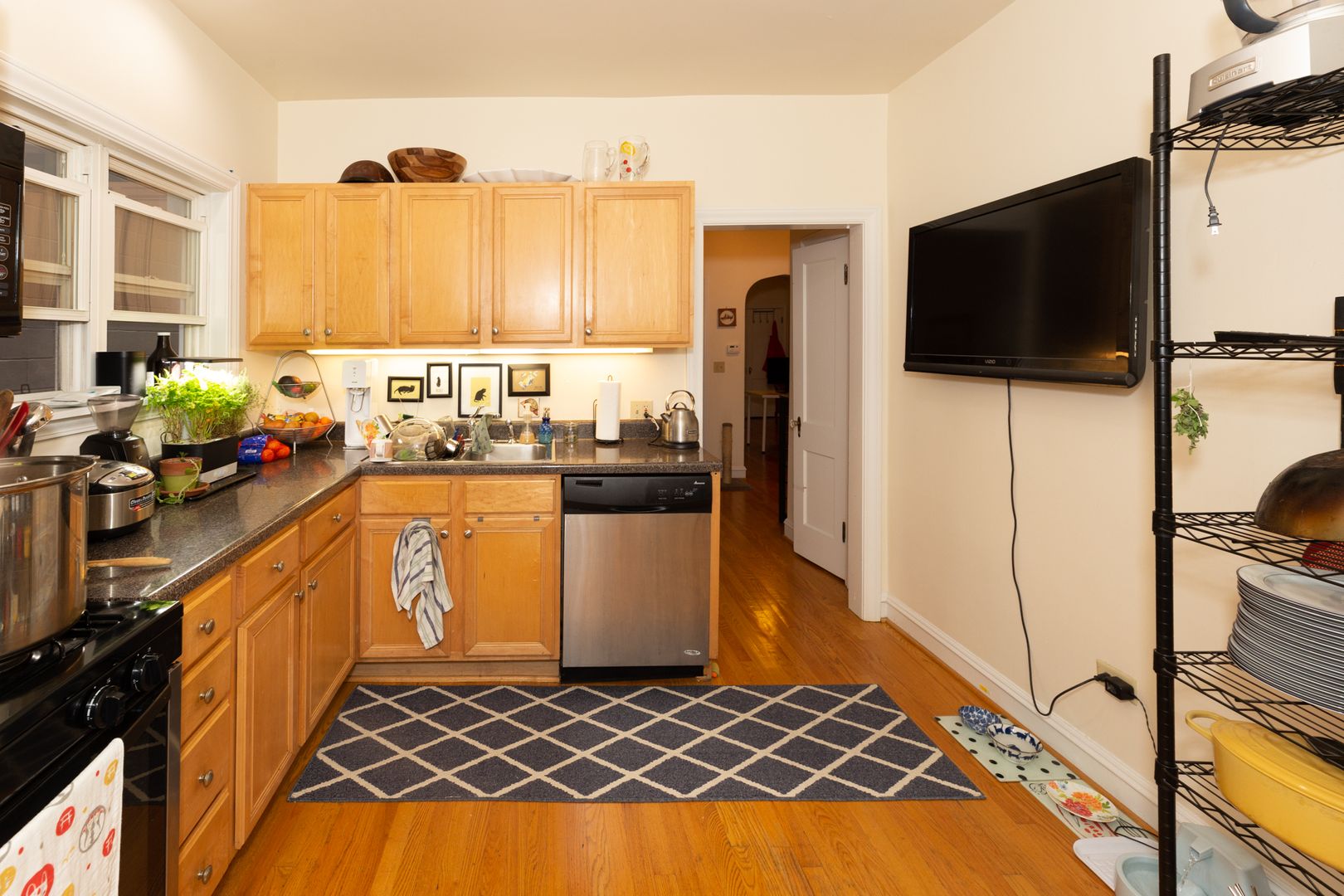 Kitchen features newer appliances, including dishwasher and microwave oven.